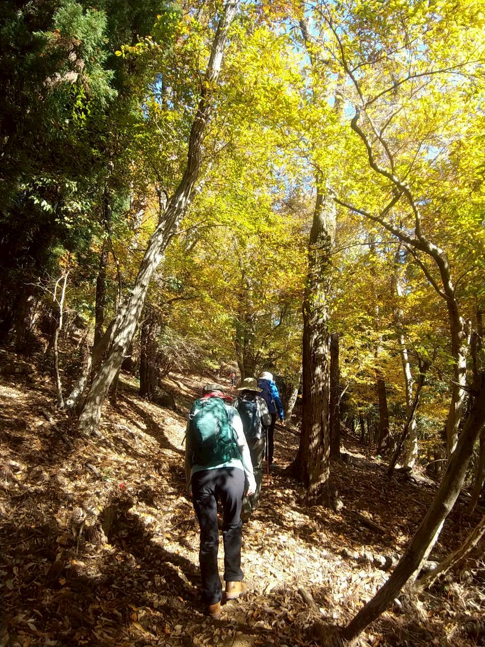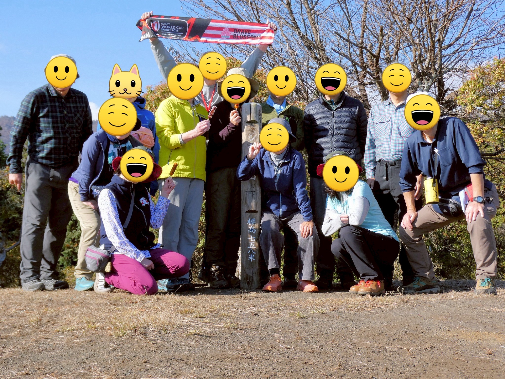 さて、出発。シダンゴ山までは林道と直登が多かったような記憶があります。雑木林は明るく、一部、紅葉も綺麗でした。山頂まで休憩回数が多く、ここでも時間を使います。シダンゴ山の山頂は、360度開けていましたが、木々に阻まれ富士山は山頂部分が少し見える程度でした。個人的には、山頂から相模湾を見ることができて満足です。休憩は休みに休んで45分。シダンゴ山の名前にちなみ、会長が用意した串団子を持って記念撮影をしました。
