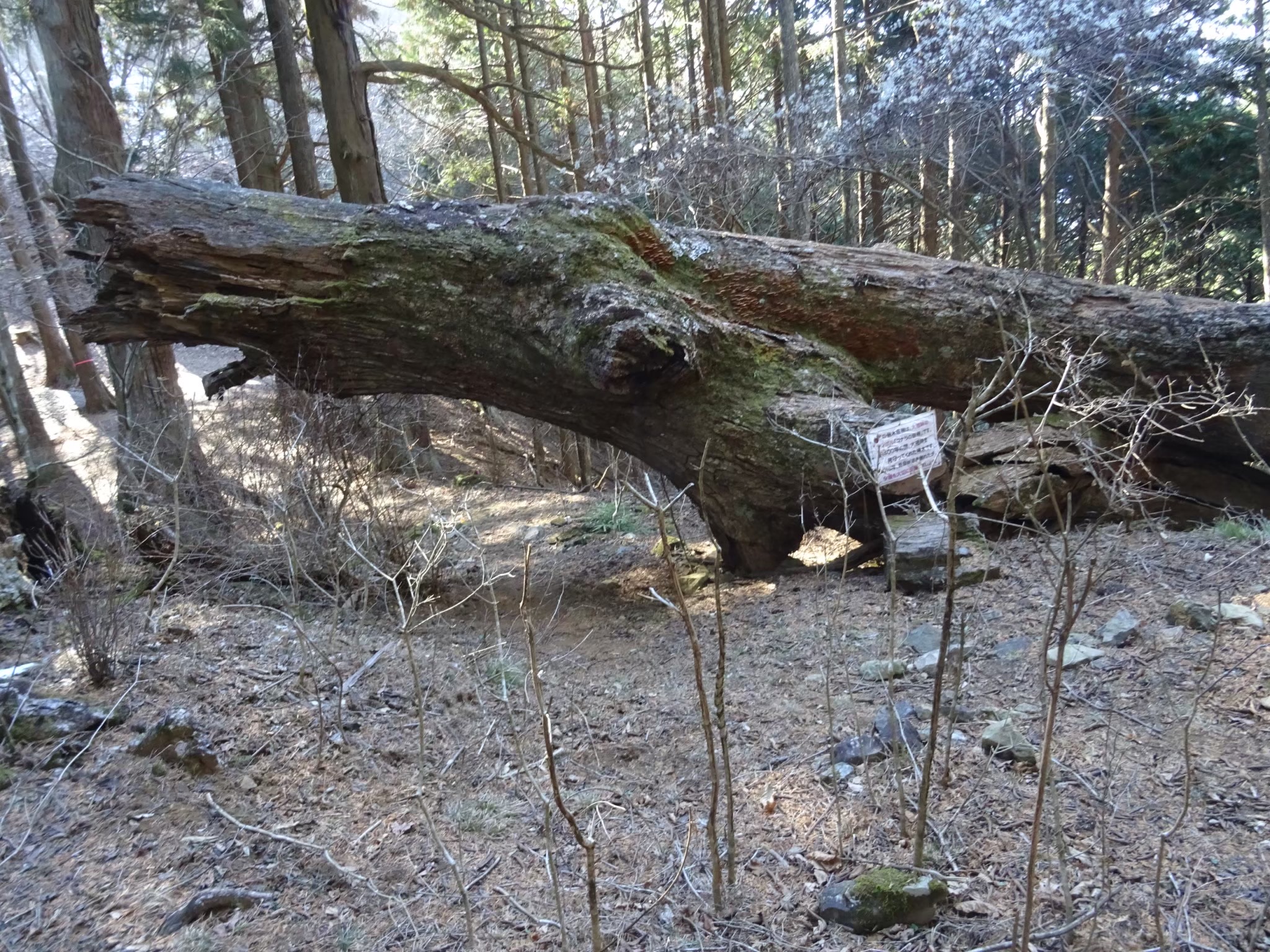 急登を登ってきたので、記念撮影後、広い山頂でしばらくゆっくりする予定であったが、展望が無い せいか、皆さん早く下山したいとのことで早めに出発。南へ急坂をひと下りしたあとは、なだらかな下り 坂。標識のある分岐からは林道のような広い尾根道が続く。所どころ石垣があり山城跡を感じながら大楢峠に到着。シンボルのコナラの大木は倒壊したままになっていて、新名所となっていた。